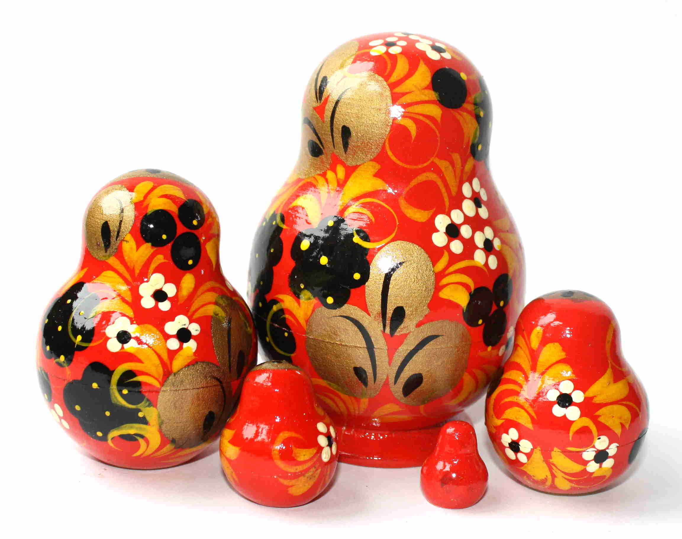 This is a 5-piece traditional Russian matryoshka nesting doll set in a vibrant red and black floral design.
