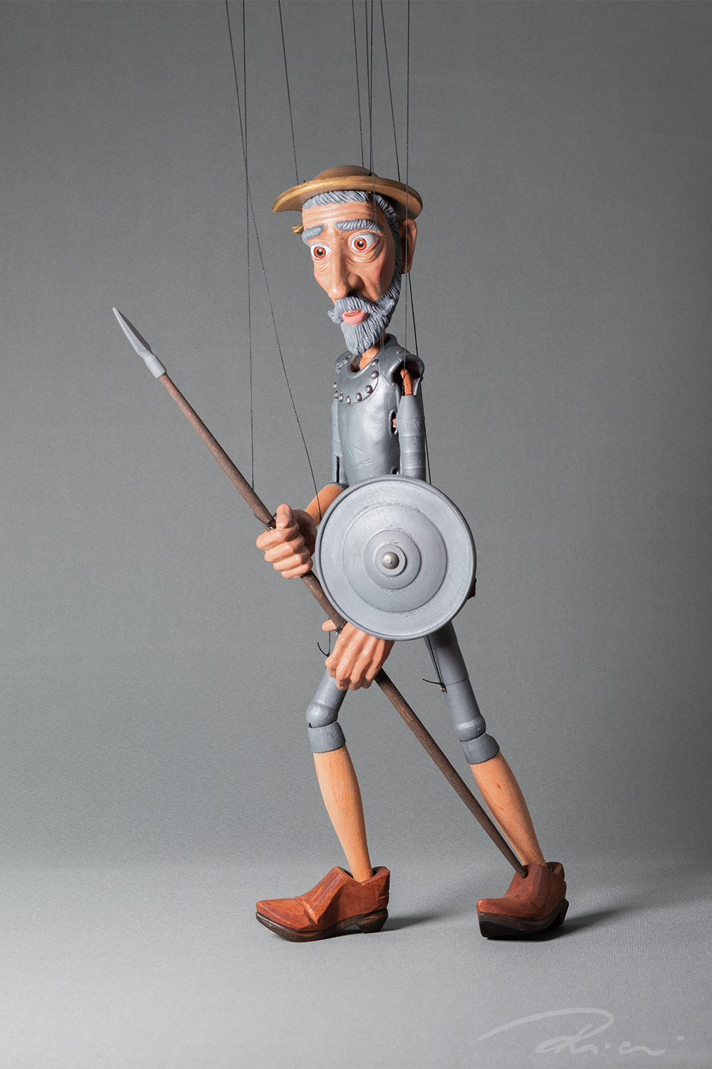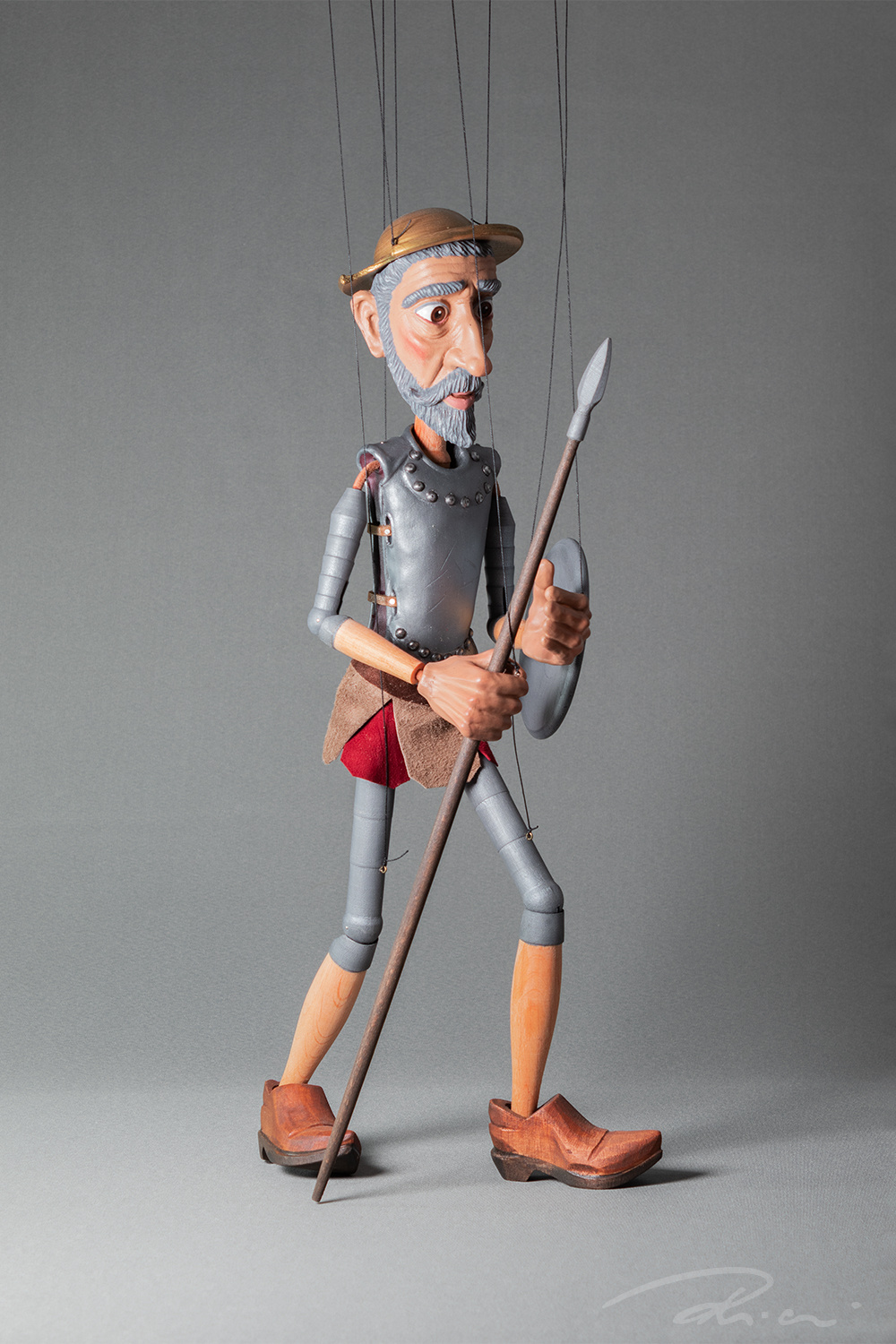 Just like in the novel, his accessories are full of character: a helmet made from a barber’s basin, a wooden shield and spear aged to look like old metal. It’s a true piece of craftsmanship – equally suited as a striking decorative piece or a fully functional marionette for both amateur and professional puppeteers.