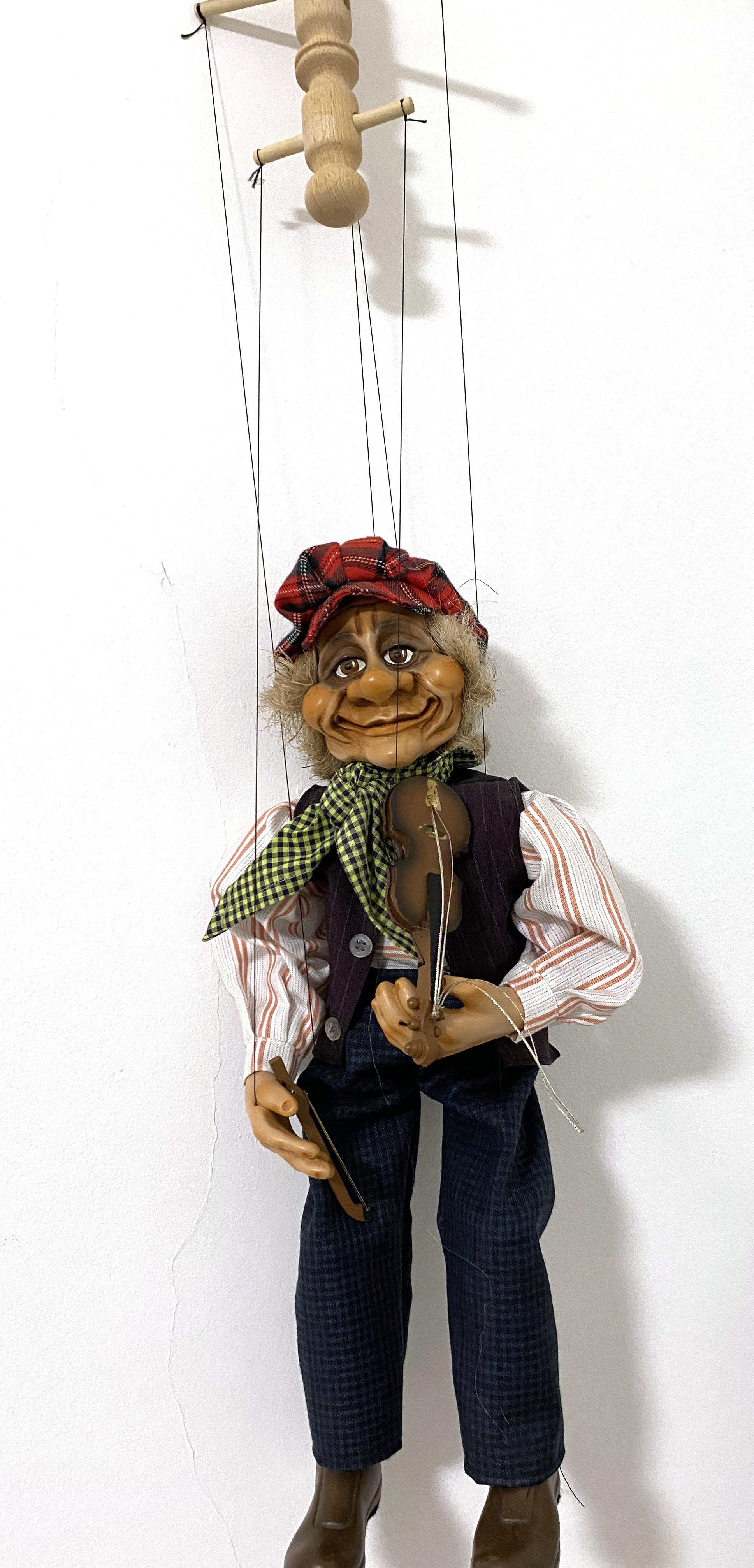 Step into a world of whimsy and rhythm with this expressive Violinist ceramic marionette, handmade in Prague and based on the famous Czech Marionette Hurvinik.