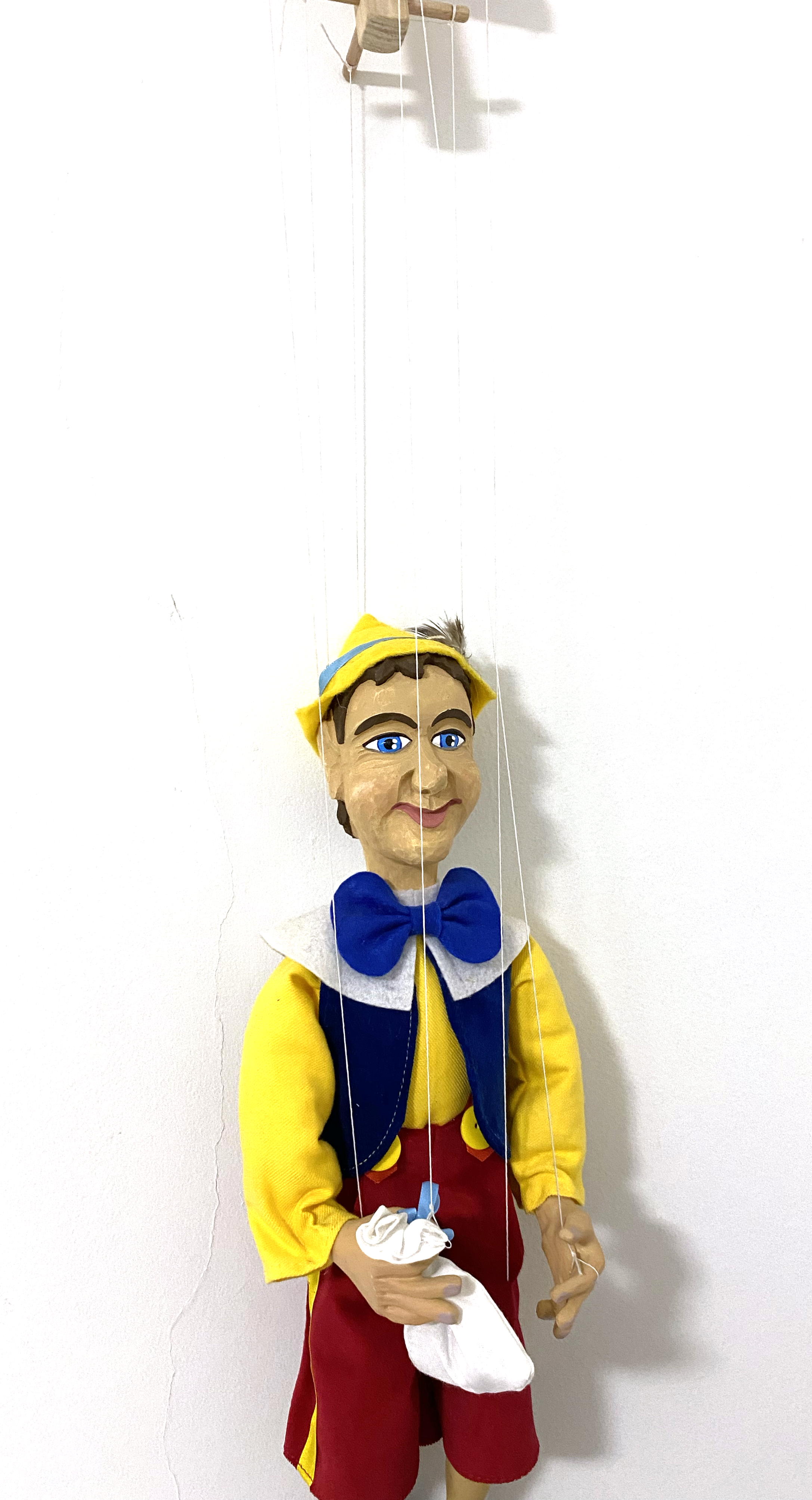 With his playful grin, pointed nose, and painted red overalls, Pinocchio is full of personality and mischief. The marionette’s wooden features are carefully carved and finished by hand, paired with fabric limbs and traditional strings that allow for expressive, animated movement.