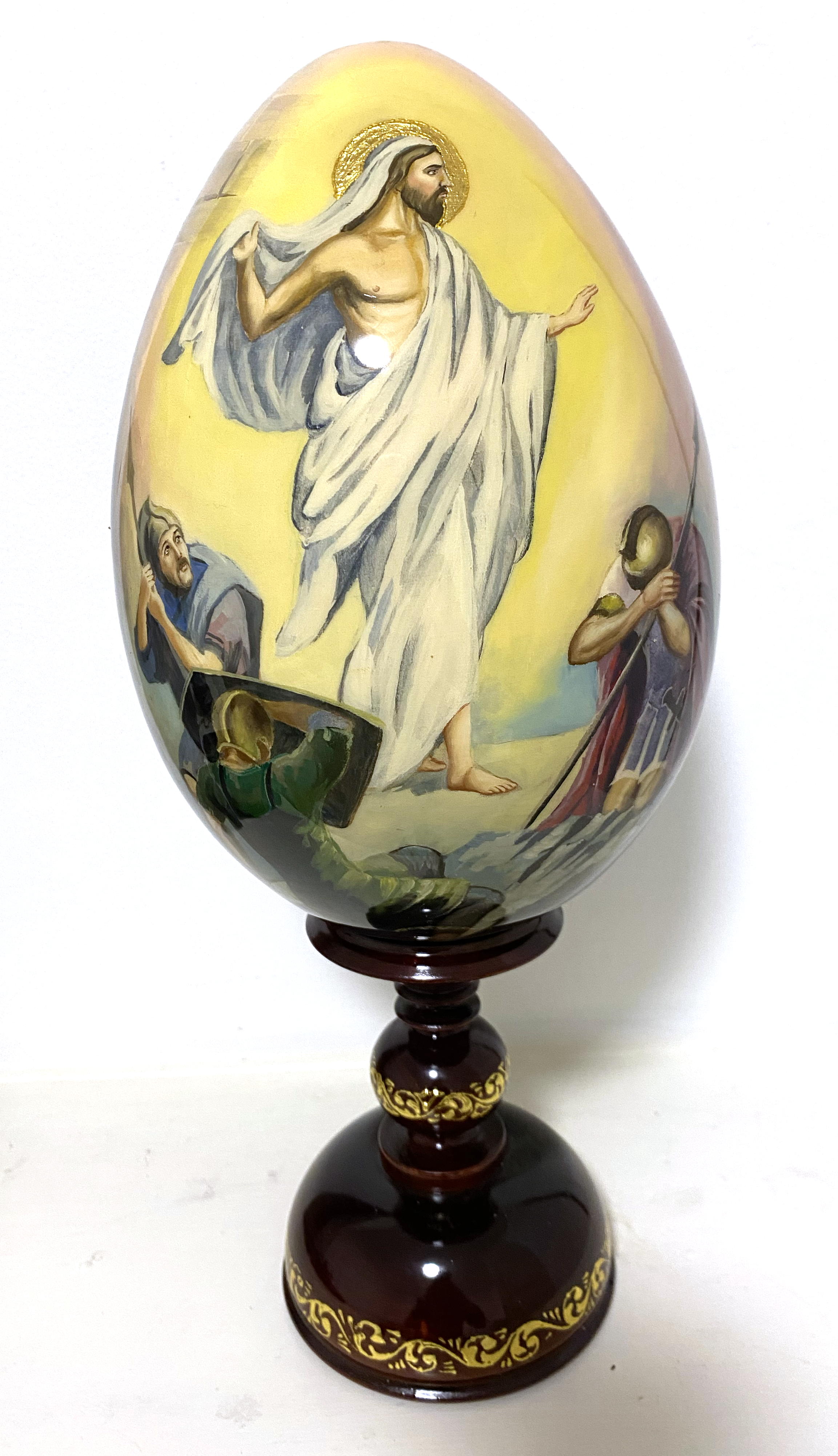 This striking double-sided icon egg is the work of renowned Russian artist Sergei Ryabov. One side features Christ in white robes, delivering a sermon with Roman soldiers diminishing into the background. The reverse depicts Christ in a more traditional style, wearing red and blue robes. Both sides are framed by luminous gold or yellow backgrounds, creating a sense of reverence and continuity. A unique collector’s piece from one of Russia’s finest icon painters.