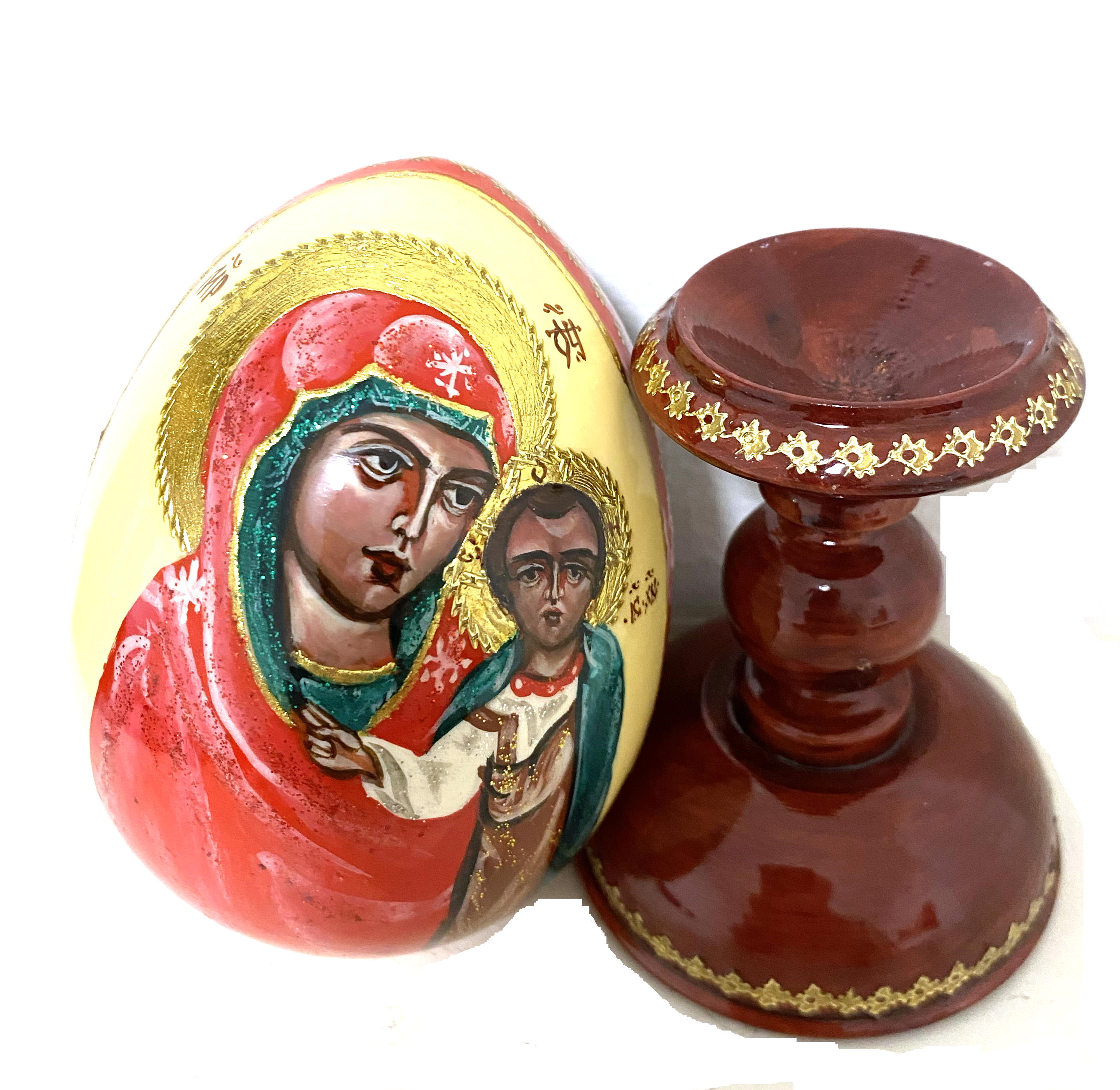 This handcrafted wooden icon egg features a peaceful depiction of the Virgin Mary and the Christ Child, painted by Russian artist Novikov in the Kazanskaya style. Mary is shown in rich red and blue robes, while the infant Jesus wears deep burgundy and blue, set against a gold background.