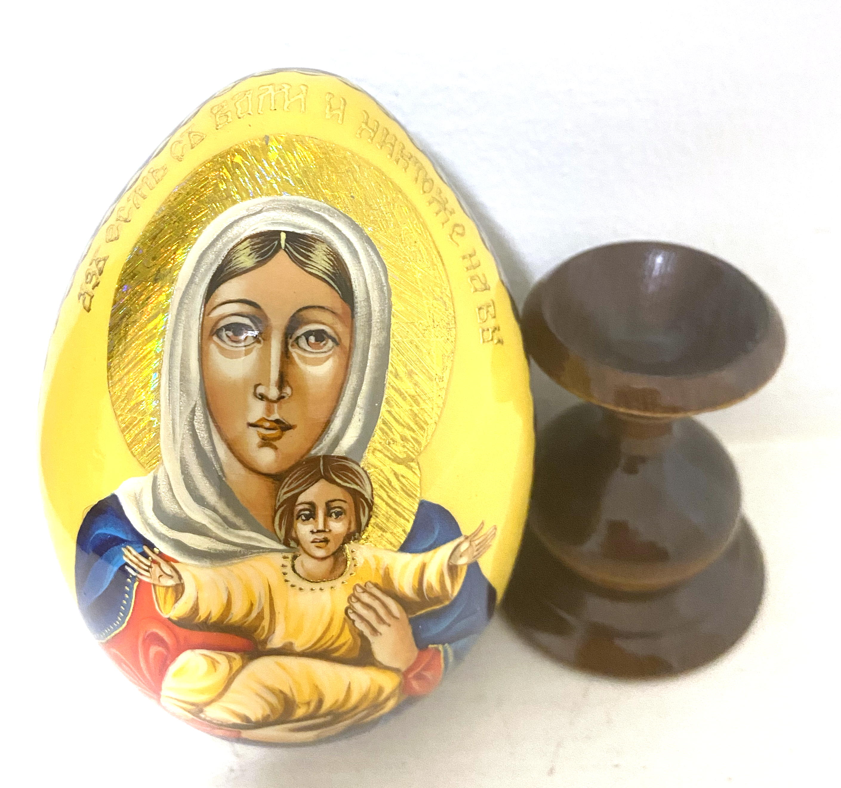 This radiant icon egg by Russian master Sergei Ryabov is a striking blend of faith, tradition and fine craftsmanship. Featuring the Virgin Mary and the Christ Child, the image is richly illuminated with gold tones throughout – from Mary’s golden halo to the garments of the infant Jesus.