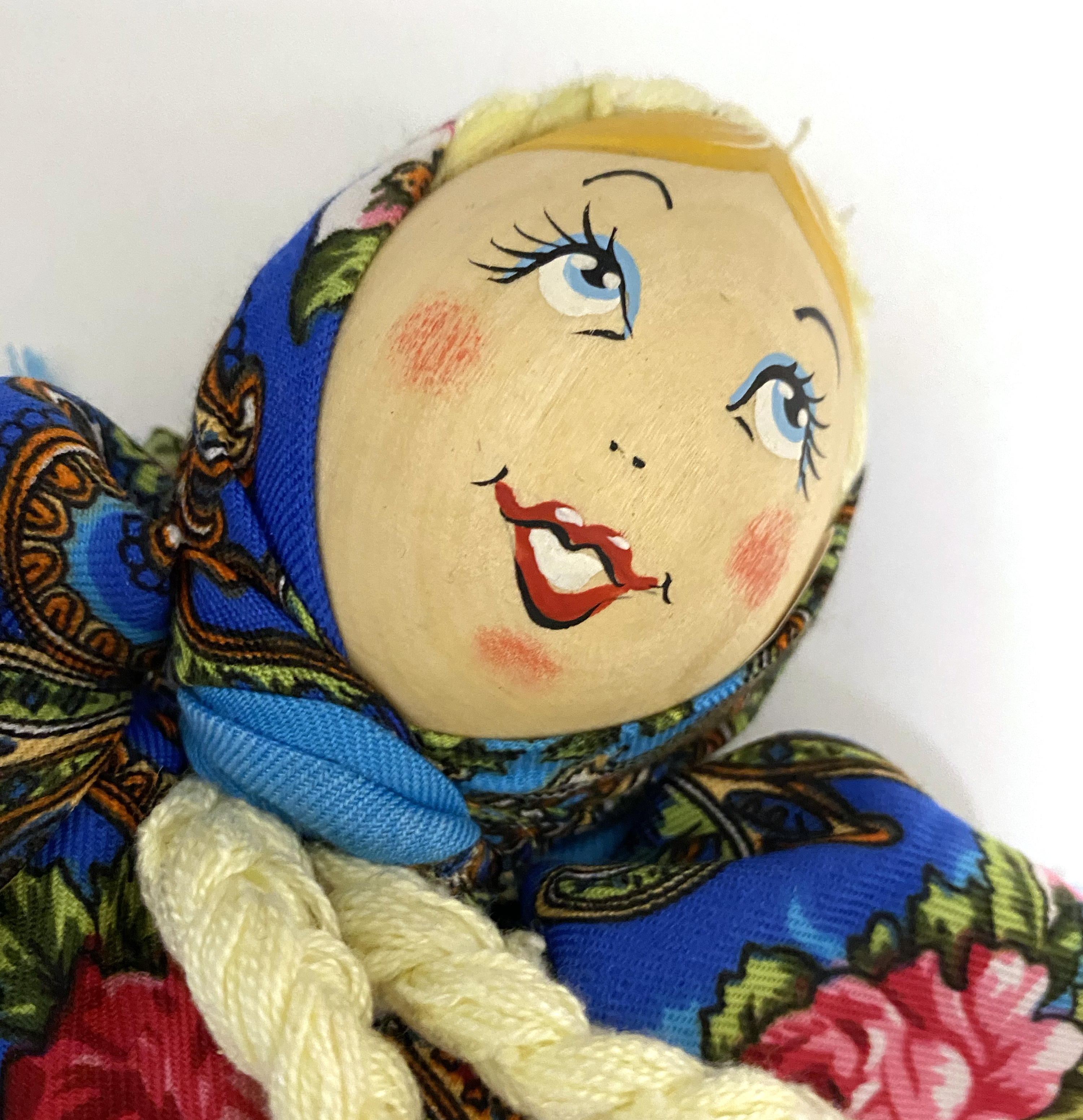 Cloth doll with wooden face, girl in blue sarafan
