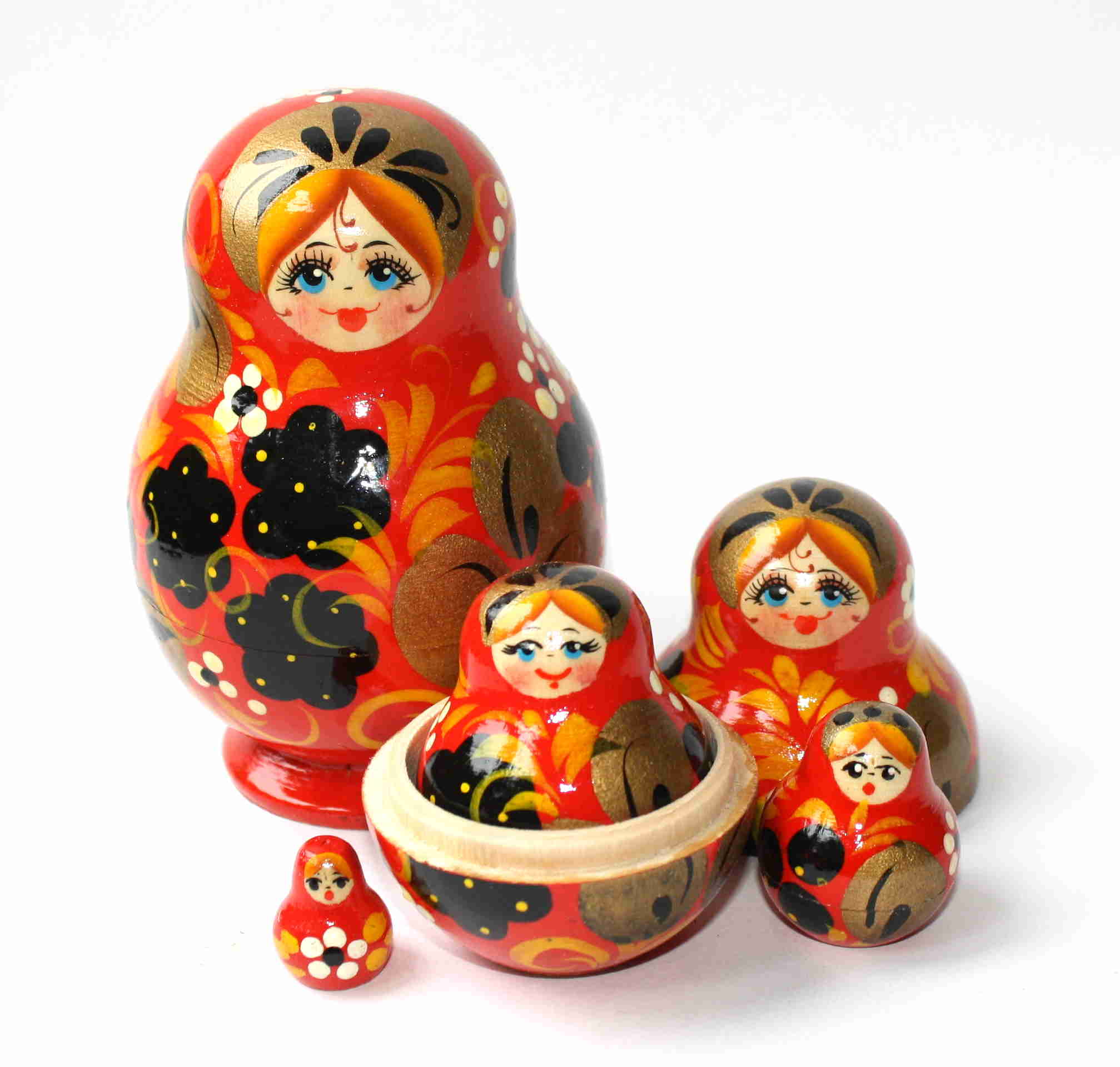 This is a 5-piece traditional Russian matryoshka nesting doll set in a vibrant red and black floral design.