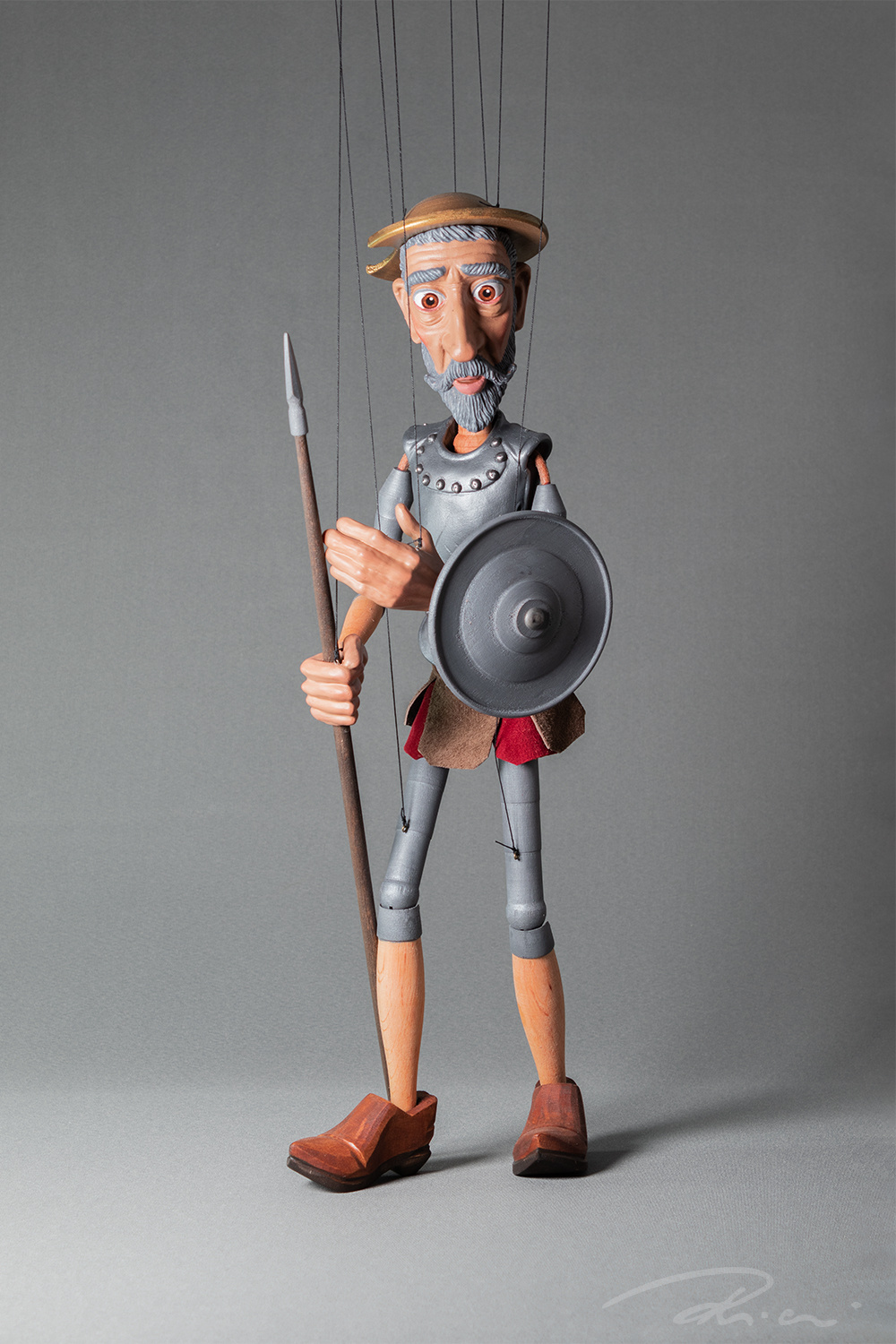 Just like in the novel, his accessories are full of character: a helmet made from a barber’s basin, a wooden shield and spear aged to look like old metal. It’s a true piece of craftsmanship – equally suited as a striking decorative piece or a fully functional marionette for both amateur and professional puppeteers.