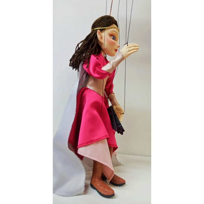 This beautiful elf puppet, dressed in shades of soft pink and fuchsia, is a magical addition to our Elf series. Hand-painted with care, her graceful features and detailed costume are sure to delight anyone who loves fantasy stories and films.