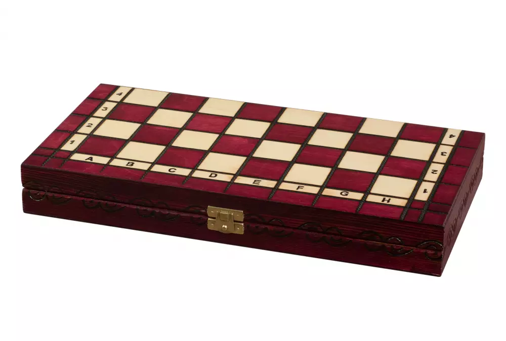 This classic Polish chess set, crafted in a refined “King's” style, makes a smart and memorable gift. The foldable wooden board measures 34 × 34 cm and features hand-painted squares. The king and queen pieces stand out with elegant decorative touches like ornamental spheres and a distinctive cross crown.