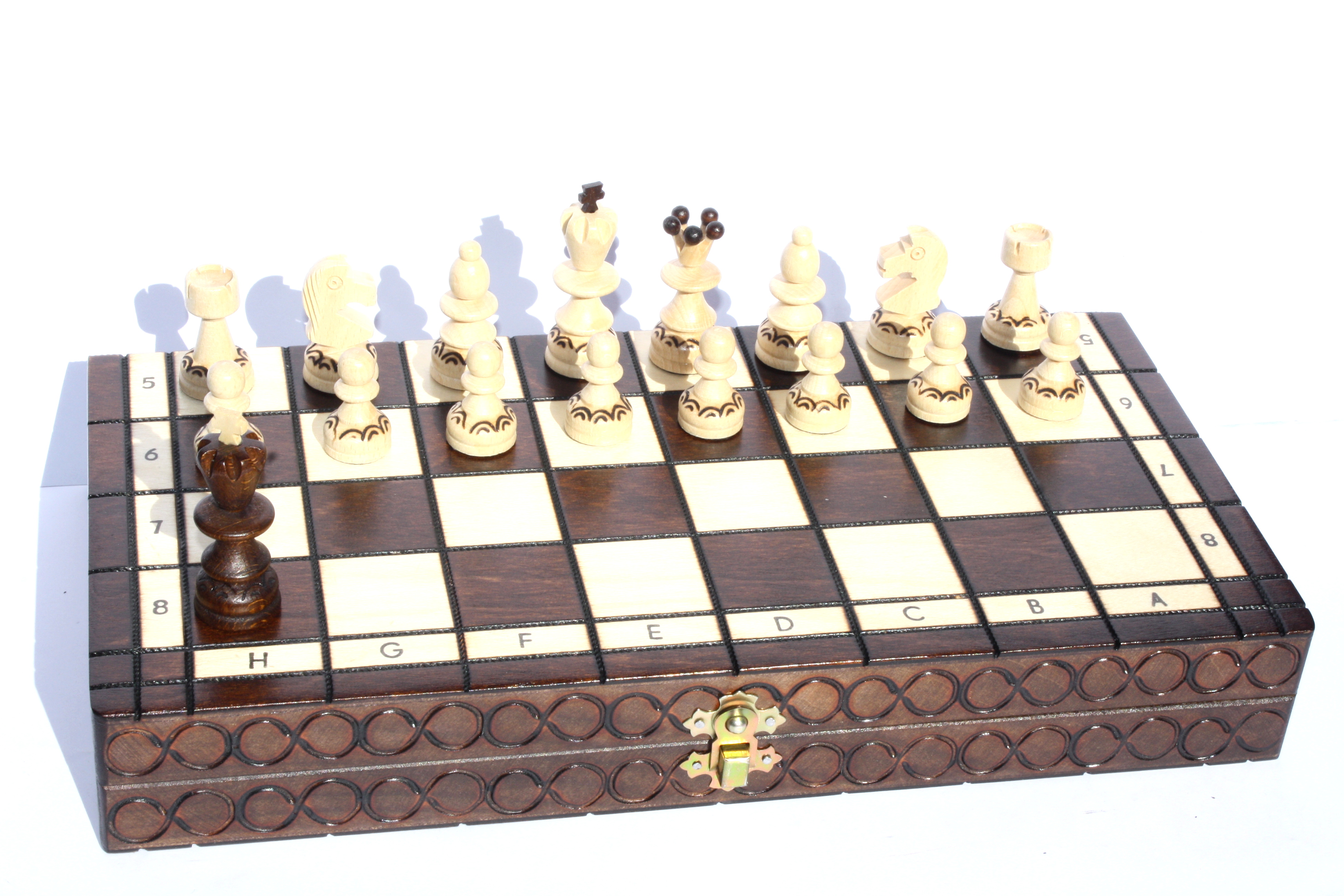 Hand-burned patterns on both the board and pieces