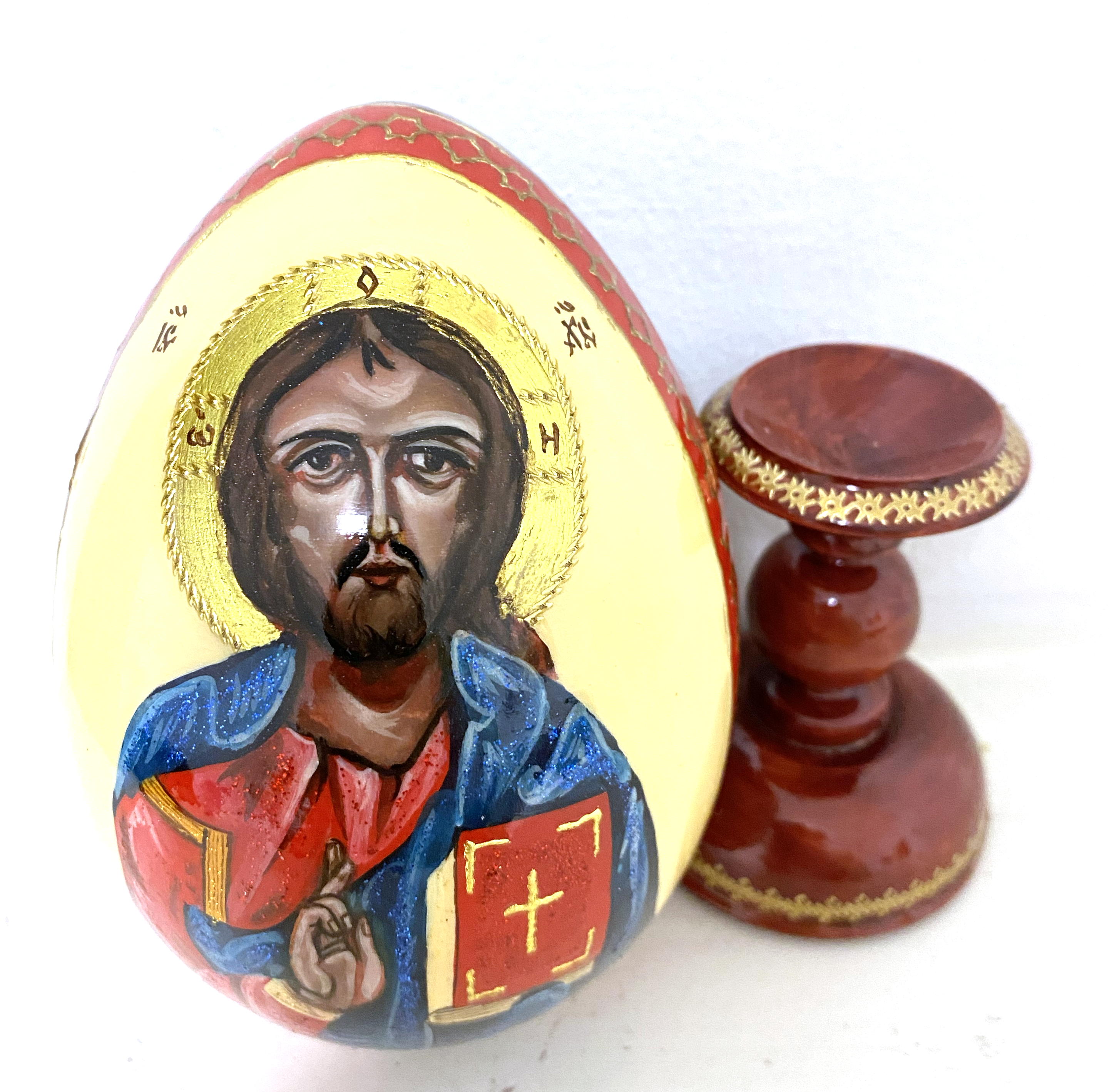 This handcrafted wooden icon egg features Christ the Almighty (Господь Вседержитель), painted in rich burgundy and blue robes against a glowing gold background.