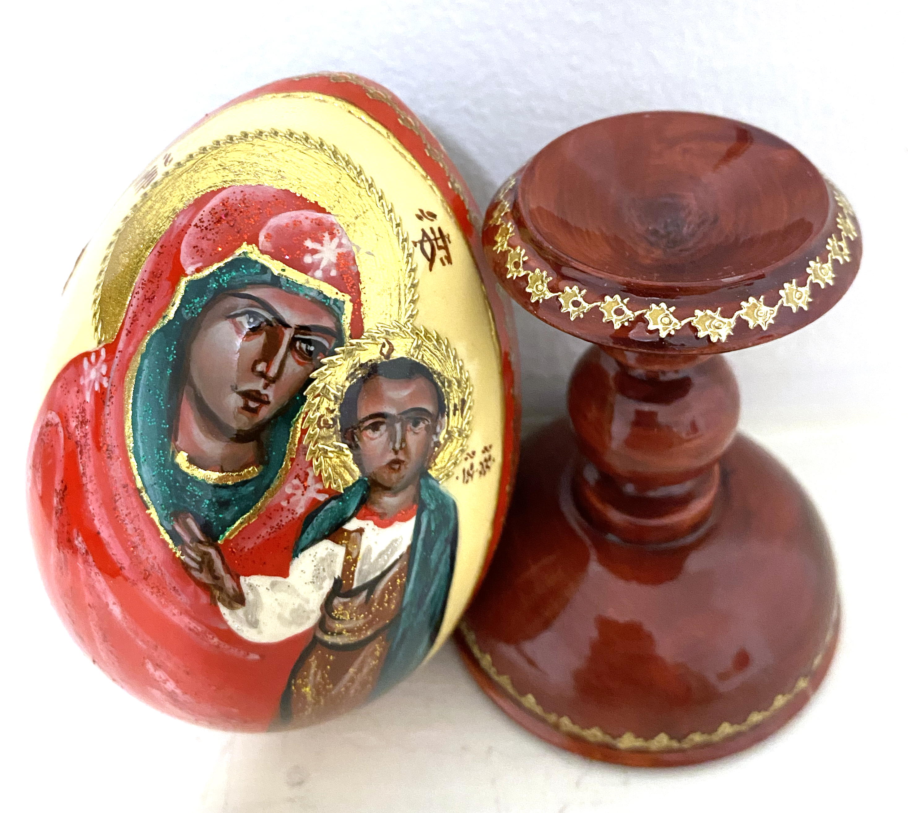 This handcrafted wooden icon egg features a peaceful depiction of the Virgin Mary and the Christ Child, painted by Russian artist Novikov in the Kazanskaya style. Mary is shown in rich red and blue robes, while the infant Jesus wears deep burgundy and blue, set against a gold background.