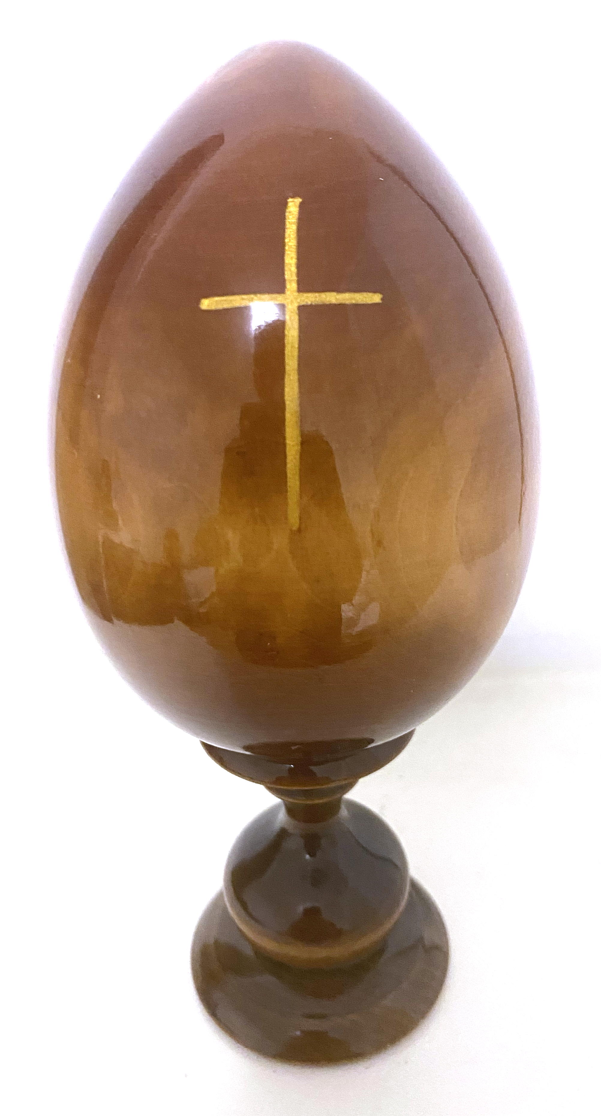 A heartfelt expression of devotion and tradition, this handcrafted icon egg features the timeless image of the Virgin Mary and Child, delicately painted by renowned Russian artist Sergei Ryabov. Rich green and burgundy tones are layered on a soft golden background, giving the piece a quiet luminosity that catches the eye without overpowering.